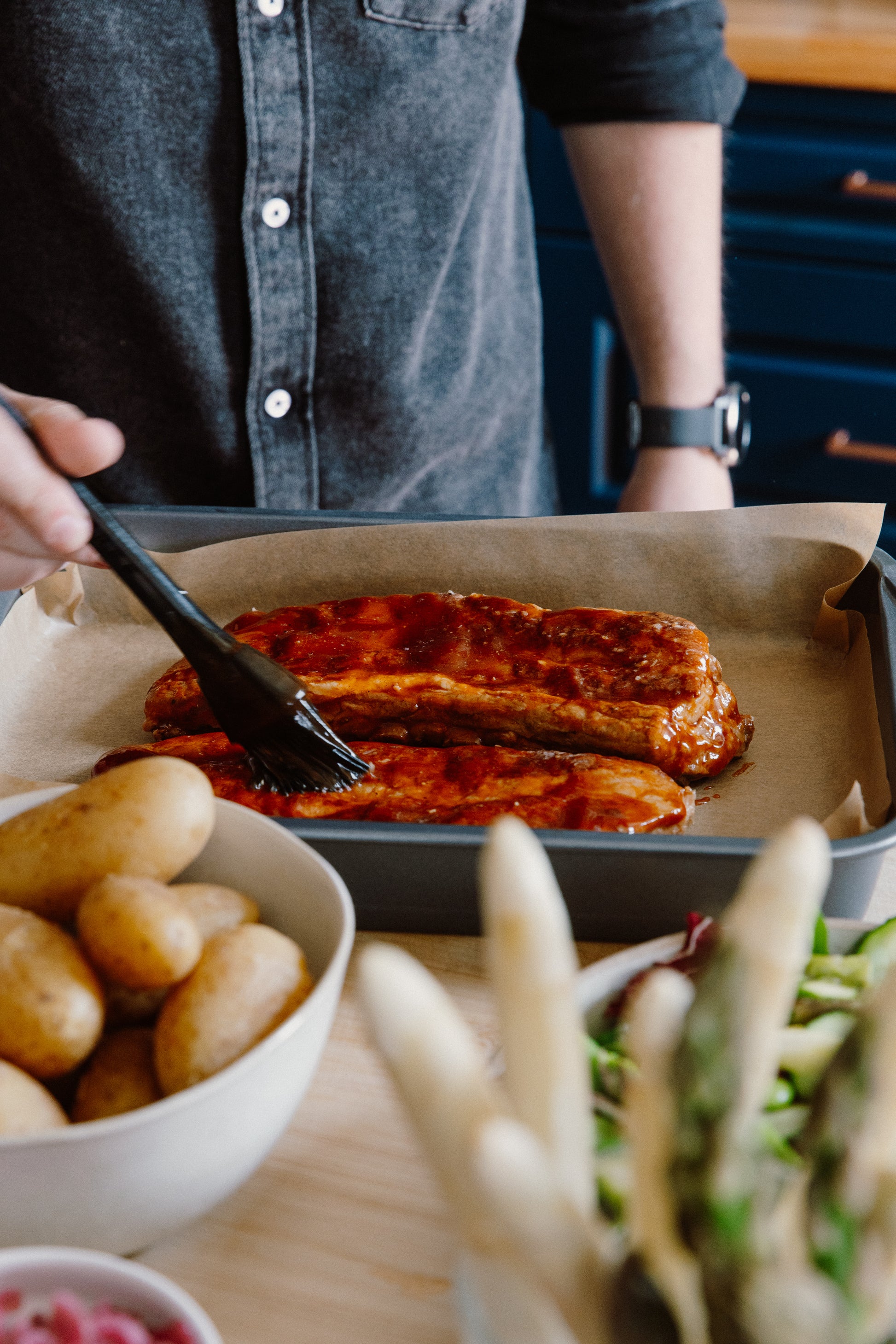 Cūkgaļas ribiņas (bez tauku kārtas), BBQ mērce, jūras sāls, melnie pipari, dabīgs garšvielu maisījums.